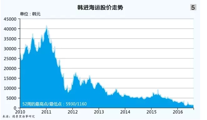 自原韩进海运社长赵秀镐2006年去世后,其遗孀崔恩英担任韩进海运社长,直至2014年。崔恩英因无力为韩进海运提供更多的金融支持,将控制权移交给大韩航空。近几年,韩进海运在遭遇全球运输业低迷后亏损严重、负债率高企不下(见图4),股价也是一路下跌(见图5)。