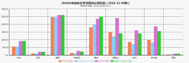 2016年12月05日,明硕股份公布了集装箱海运费运价指数(第2016-12-05期),本次运价区间为2016-12-05至2016-12-12。数据来源于货代家族(www.hd168.com)从数据上来看,本期出现强势上涨的行情,如加勒比航线、欧洲航线、东南亚航线、地中海航线均出现不同幅度的涨价;印巴航线、南美航线、中东航线、日韩航线继续维持上周的态势;只有美加航线均出现小幅回调趋势。