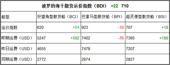 BCI指数较昨日上涨64点为620点,即期运费上涨592美元为5247美元;