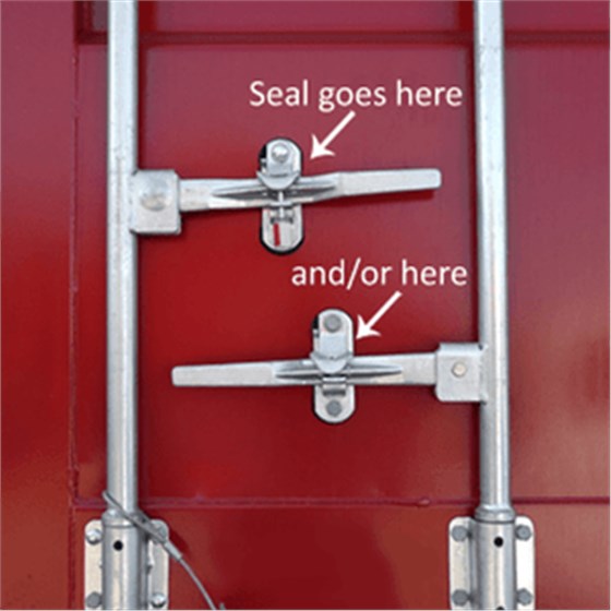 封条可以放在一个或两个锁杆上。如果需要,你可以在左边的门上放置一个附加的封条,但是在安全方面来说,这个其实无关紧要,除非货物不能够通过一扇门取出。