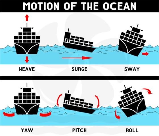 当集装箱在船上并且船舶在航行时,船舶会以如下所示的6中方式移动。当船舶移动时,集装箱和集装箱内包装的货物也会随之移动。